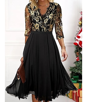Damen Midikleid schwarzes kleid Spitzenkleid Partykleid Cocktailkleid Elegant Mode Party Formell Urlaub Hochzeitsgast Normale Passform Einfarbig Dreiviertelarm V Ausschnitt Schwarz Frühling Herbst