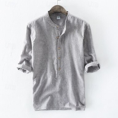 Herren Hemd Leinenhemd Popover-Hemd Sommerhemd Freizeithemd Strandhemd Einfach Urlaub Lässig Schwarz Weiß Khaki Dunkelgrau Langarm Stehkragen Frühling Herbst Bekleidung Tasche