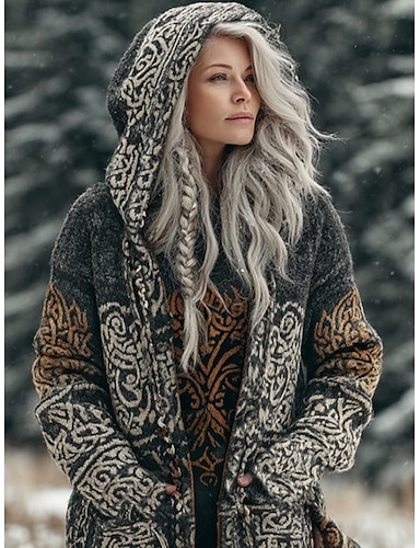Damen-Wikingerpullover im Vintage-Stil mit coolem geometrischem Rundhalsausschnitt, Kapuze und normalem Print, langärmlig, Strick, für Outdoor-Aktivitäten, Alltag, dunkelgrau, Herbst/Winter