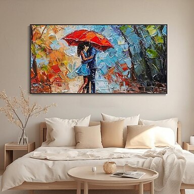Paar geht im Regen Ölgemälde handgemalt roter Regenschirm Frau Stadt Straßenszene Ölgemälde Hochzeitstag Geschenk romantische Liebhaber Ölgemälde minimalistische Dekoration