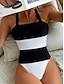 Damen Badeanzug Einteiler Monokini Bademode Bauchkontrolle Hohe Taille Schlank Rückenfrei Elegant Urlaub Farbblock Gestreift V Ausschnitt Ärmellos Badeanzüge