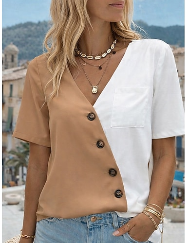 Damen Sommerhemd Freizeithemd Bluse Patchwork Knöpfe Einfarbig Elegant Vintage Täglich Kurzarm V Ausschnitt Normale Oberteile Täglich Outdoor Ferien Weiß Marineblau Aprikose Sommer Frühling