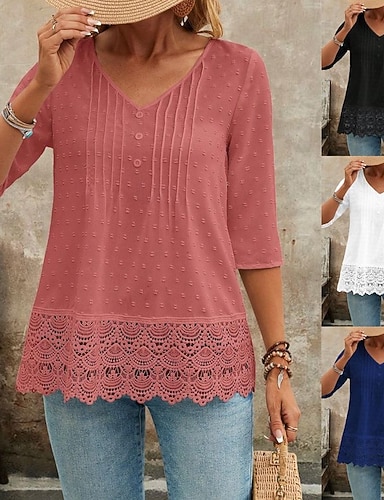Damen Popover-Hemd Sommerhemd Freizeithemd Bluse Spitze Patchwork Knöpfe Einfarbig Elegant Mode Lässig Dreiviertelarm V Ausschnitt Normale Oberteile Täglich Blau Schwarz Weiß Rosa Frühling Herbst
