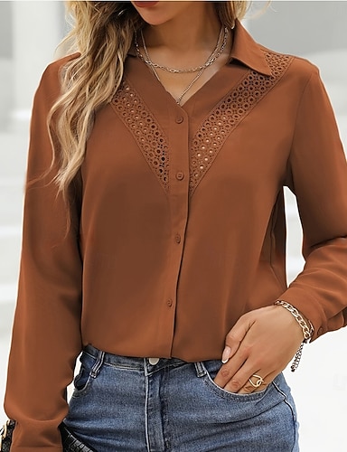 Damen Freizeithemd Knopfhemd Bluse Spitze Lochmuster Knöpfe Täglich Stilvoll Lässig Langarm Umlegekragen Normale Oberteile Ferien Strandbekleidung Urlaubskleidung Braun Sommer Frühling Herbst