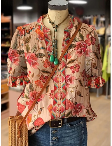 Damen Bluse Gerafft Knöpfe Blumen Stilvoll Lässig Kurzarm V Ausschnitt Normale Oberteile Täglich Khaki Sommer Frühling