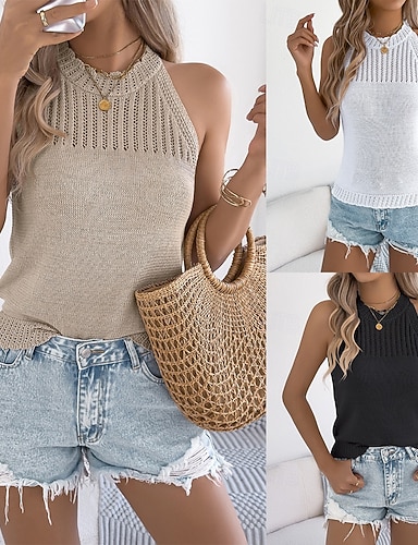 Damen Pullover Pullunder Lässig Weich Einfarbig Gehäkelt Neckholder Gestrickt Ärmellos Normale Oberteile Stricken Täglich Outdoor Wochenende Schwarz Weiß Sommer Frühling