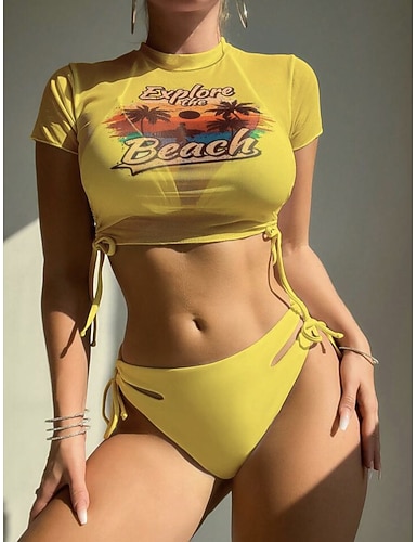 Damen Badeanzug Bikini Dreiteilig Freche Unterhose Bademode Schlank Rückenfrei Urlaub Strandbekleidung Grafik Hoher Ausschnitt Ärmellos Badeanzüge