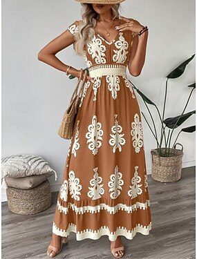 Damen Maxikleid Boho-Kleid Vintage-Kleid Freizeitkleid Elegant Mode Modern Outdoor Strand Urlaub Normale Passform Grafik Kurzarm V Ausschnitt Schwarz Gelb Marineblau Grün Sommer Frühling