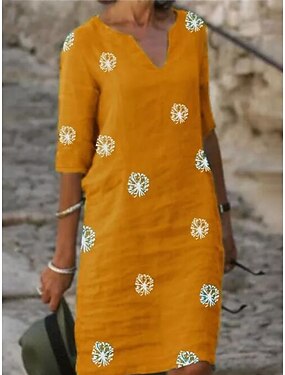 Damen Midi Kleid Gelb Rot Grün Sommer Frühling Shift Kleid Lässig Alltag Lässige Passform Blume Eingekerbter Ausschnitt