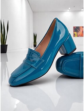 Damen-Loafer aus blauem, glänzendem Lackleder mit dickem Absatz – moderne Slip-On-Arbeitsschuhe mit quadratischer Zehenpartie für Büroangestellte