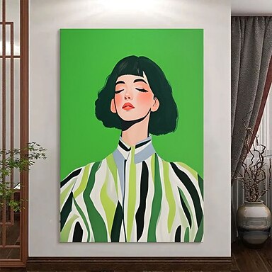 Handgemaltes smaragdgrünes abstraktes Ölgemälde eines Mädchens, großes Wandbild, zeitgenössisches Kunstwerk, minimalistisches Gemälde, Wohnzimmerwandbild, gestreiftes Frauengemälde