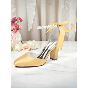 Damen Pumps aus orangefarbenem Satin mit Blockabsatz und Perle &Knöchelriemen aus Band – elegante High Heels mit spitzer Spitze für Hochzeiten, Partys &Abendveranstaltungen