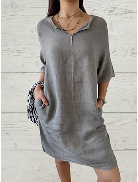 Frauen Leinenähnliche Fake Baumwolle Leinen Mini Kleid Shift Kleid Sommer Kleid Lässig Alltag Lockerer Schnitt Einfarbig 3/4 Länge Ärmel V-Ausschnitt Weiß Dunkelgrau Beige Grau Sommer Frühling