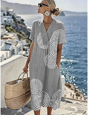 Damen Midikleid Sommerkleid A Linie Kleid Urlaub Lässig Strand Strand Party Lässiger Schnitt Grafik Geometrisch Kurzarm V Ausschnitt Blau Purpur Grün Khaki Sommer Frühling product tag