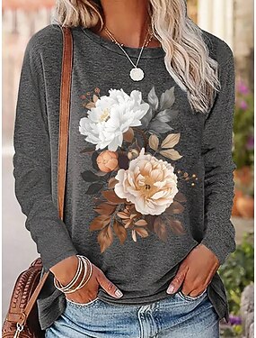 Damen T Shirt Druck Blumen Grafik Pflanzen Mode Stilvoll Klassisch Langarm Rundhalsausschnitt Rundhals Normale Oberteile Täglich Wochenende Grau Sommer Frühling Herbst