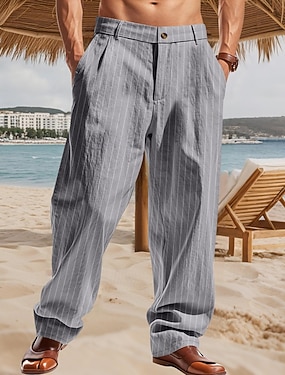 Herren Anzughose Leinenhosen Hose Sommerhose Baggy-Hosen Tasche Gerader Schnitt Gestreift Komfort Atmungsaktiv Volle Länge Urlaub Täglich Ferien Urlaub Hawaiianisch Schwarz Weiß Unelastisch