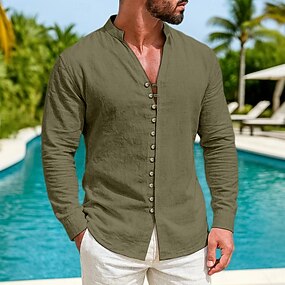 Herren Hemd Leinenhemd Popover-Hemd Sommerhemd Strandbekleidung Henley Hemd Einfarbig Urlaub Heim Rosa Himmelblau Grün Khaki Langarm Stehkragen Sommer Frühling Bekleidung Knöpfe
