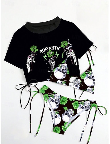 Damen Bikini 3-teiliges Badeanzug Rock Schlank Rückenfrei Urlaub Strandbekleidung Totenkopf Halterhals Kurzarm Badeanzüge