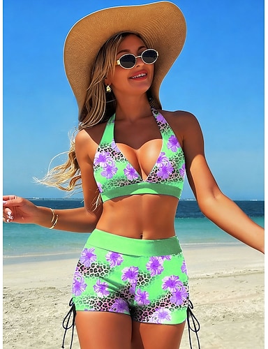 Damen Badeanzug Bikini Zweiteilig Shorts Bademode Patchwork Rückenfrei Urlaub Strandbekleidung Blumen Neckholder Ärmellos Badeanzüge