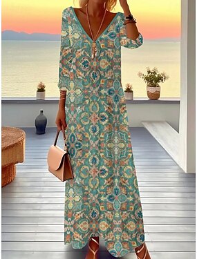 Damen Maxikleid Kleid-Set A Linie Kleid Urlaub Boho Strand Normale Passform Blumen Grafik Dreiviertelarm V Ausschnitt Blau Schwarz Rosa Purpur Sommer Frühling Herbst Winter
