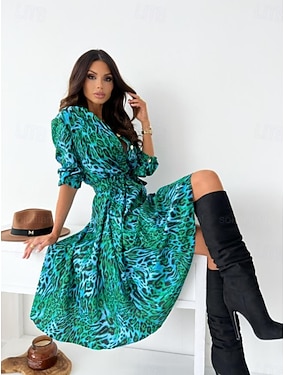 Damen Maxidress Casual kleid Boho Chic Kleider Böhmen Brautkleider schlicht Boho Urlaub Täglich Strand Lockere Passform Leopard 3/4 Ärmel V Ausschnitt Blau Grün Sommer Frühling