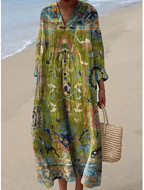 Damen Maxikleid Sommerkleid A Linie Kleid Urlaub Lässig Boho Strand Party Normale Passform Grafik Geometrisch Paisley-Muster Langarm V Ausschnitt Blau Grün Khaki Sommer Frühling