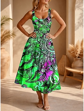 Damen Midikleid Sommerkleid A Linie Kleid Urlaub Lässig Boho Strand Date Normale Passform Grafik Stammes Ärmellos U-Ausschnitt Blau Purpur Orange Grün Sommer Frühling
