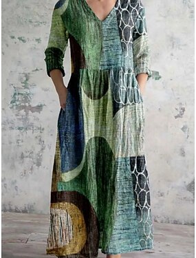Damen Freizeitkleid Farbblock Patchwork V-Ausschnitt Maxi Langes Kleid Casual Alltag 3/4 Ärmel Sommer Frühling