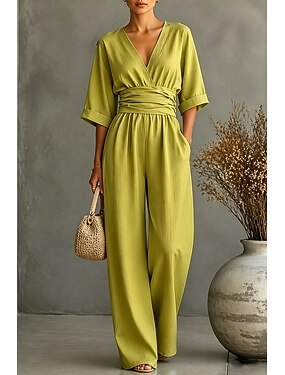 Damen Normal Overall Elegant Einfarbig Kurzarm Weites Bein V Ausschnitt Täglich Urlaub Normale Passform Schwarz Gelb Hellgrün Sommer