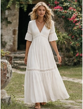 Damen Maxikleid A Linie Kleid Sommerkleid Lässig Täglich Normale Passform Einfach Halbarm V Ausschnitt Weiß Sommer