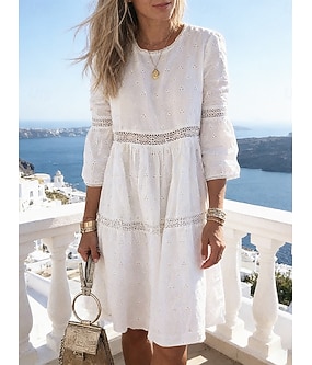 Damen Knielanges Kleid Weißes Spitzenkleid Kleid mit Lochstickerei Elegant Mode Modern Outdoor Strand Urlaub Lässiger Schnitt Einfach Halbarm Rundhalsausschnitt Blau Weiß Gelb Purpur Sommer Frühling