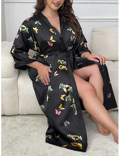 Damen Freizeitkleidung Robe Nachthemd Mode Lässig Grafik Schmetterling Satin-Seidenpyjamas Patchwork Kleid Heim Urlaub Langarm V Ausschnitt Schwarz Sommer Frühling Normale Passform Lässiger Schnitt