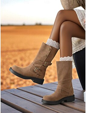 Damen-Wadenstiefel aus Wildleder mit Schnallenriemen, lässiger Retro-Stil, bequeme Schuhe mit niedrigem Absatz für urbane Streetwear und Alltagsoutfits