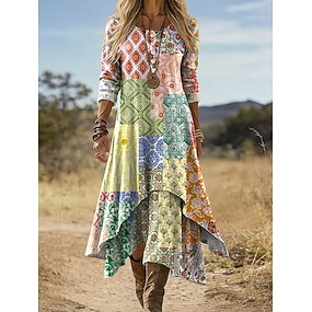 Damen Midi Kleid Boho Shift Kleid Urlaub Lässig Täglich Feiertag Lockere Passform Grafik Geometrisch Paisley Lange Ärmel Rundhals Hellgelb Hellgrün Fuchsia Braun Sommer Frühling Herbst