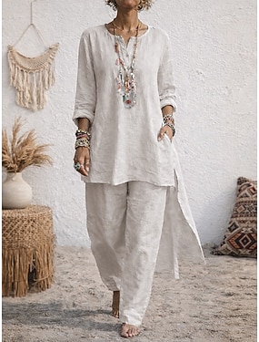 Boho-Hemden-Sets für Damen, zweiteilig, in Leinenoptik, aus Baumwollimitat, mit weitem Bein, langen Ärmeln, V-Ausschnitt, schlichtem Streetwear-Stil, lässig, für den Alltag, in Blau, Schwarz und Weiß, Sommer, normale Passform