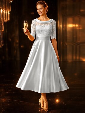 A-Linie Tee-Länge Partykleid Cocktailkleid Kleid für Hochzeitsgäste Brautmutterkleid Halbarm Rundausschnitt Elegant Vintage Hochzeitsgast Satin Spitze mit Gerafft Applikationen