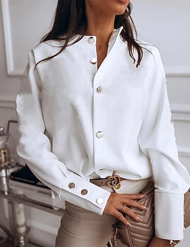 Damen Kleidhemd Knopfhemd Bluse Patchwork Knöpfe Einfarbig Einfach Elegant Stilvoll Klassisch Langarm Stehkragen Normale Oberteile Täglich Arbeit Ausgehen Weiß Sommer Frühling Herbst