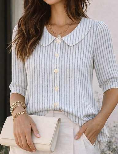 Damen Hemd Sommerhemd Freizeithemd Knopfhemd Gestreift Elegant Urlaub Mode Halbarm Peter Pan Kragen Normale Oberteile Streetwear Strand Ferien Blau Sommer Frühling Herbst