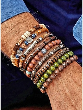 Herren-Armbandset aus Holzperlen im Boho-Stil, 10-teiliges Set aus elastischen, stapelbaren Perlenarmbändern für Strandurlaub, Freizeitkleidung, Reisen und Festival-Looks