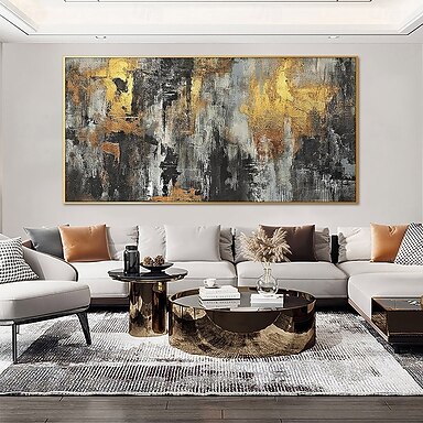 große Wandkunst minimalistisches abstraktes Berggemälde, handgemalt, extragroßes Landschaftsfoliengemälde, Wandkunst, grau-goldenes Leinwandgemälde auf Leinwand, abstraktes Gemälde für Wohnzimmer