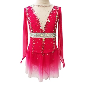 Eiskunstlaufkleid Damen Mädchen Eislaufen Kleid Rosenrot Patchwork Daumenloch Netzstoff Spandex Dehnbar Training Übung Professionell Eiskunstlaufkleidung Thermowarm Kristall / Strass Langarm