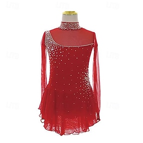 Eiskunstlaufkleid Damen Mädchen Eislaufen Kleid Rot Patchwork Daumenloch Netzstoff Spandex Dehnbar Training Übung Professionell Eiskunstlaufkleidung Thermowarm Kristall / Strass Langarm Eislaufen