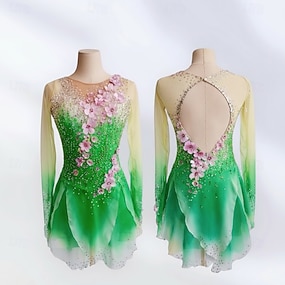 Eiskunstlaufkleid Damen Eislaufen Kleid Grün Patchwork Offener Rücken Dehnbar Training Wettbewerb Eiskunstlaufkleidung Klassisch Kristall / Strass Langarm Eislaufen Eiskundstlauf