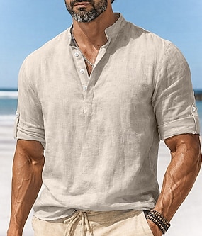 Herren Leinenhemd Popover-Hemd Freizeithemd Strandhemd Stehkragenhemd Einfach Lässig Strand Blau Schwarz Weiß Rosa Langarm Henley Sommer Frühling & Sommer Bekleidung Knöpfe