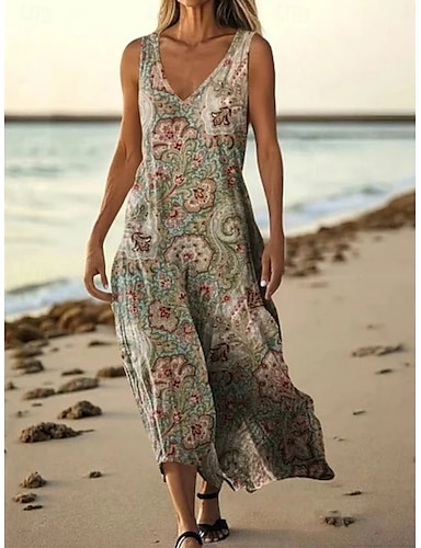 Damen Langes Kleid Maxikleid Freizeitkleid Trägerkleid Sommerkleid afrikanisch Täglich Ferien Strand Normale Passform Blumen Ärmellos V Ausschnitt Grau Sommer