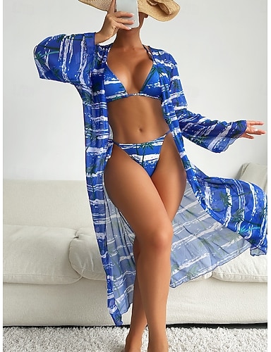 Womens Bikini 3-teiliger Badeanzug Palme Briefs Slim Rückenfrei Urlaub Strandbekleidung Floral Blätter Scoop-Hals Ärmellose Bademode