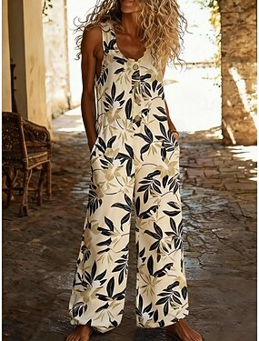 Damen-Jumpsuit aus Leinenimitat mit normalem Schnitt, Blumenmuster, ärmellos, weitem Bein, U-Ausschnitt, Taschen und Knöpfen, für Freizeit, Urlaub und Alltag, lockere Passform, in Blau, Königsblau und