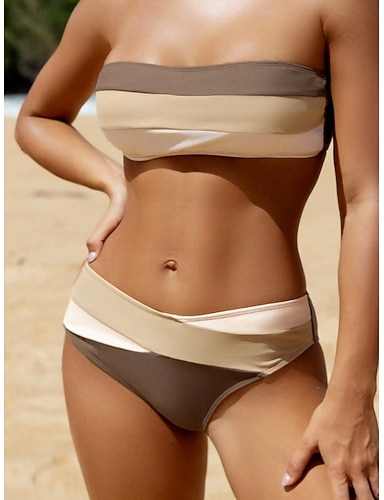 Damen Badeanzug Bikini Zweiteilig Slips Bademode Schlank Rückenfrei Urlaub Strandbekleidung Gestreift Trägerlos Ärmellos Badeanzüge