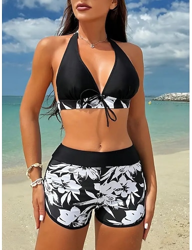 Damen Badeanzug Bikini Zweiteilig Shorts Bademode Patchwork Rückenfrei Urlaub Strandbekleidung Blumen Neckholder Ärmellos Badeanzüge