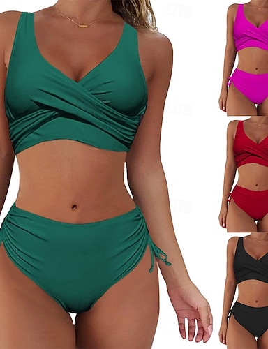 Damen Bikini 2-Teilig Badeanzug Rüsche Frech Bauch Kontrolle Hohe Taille Slim Rückenfrei Urlaubs Strandbekleidung Einfarbig V-Ausschnitt Ärmellos Bademode